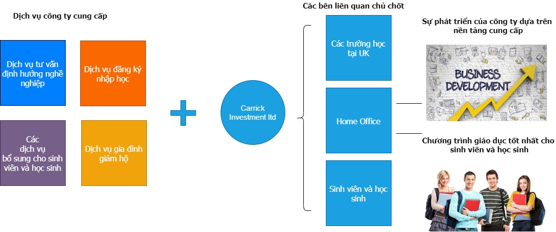 Xuất phát từ nhu cầu du học tại Vương Quốc Anh ngày một tăng cao, công ty đầu tư Carrick Limited được thành lập để hỗ trợ các du học sinh sớm tiếp cận với những trung tâm giáo dục hàng đầu thế giới. Với nhiều năm kinh nghiệm làm việc tại Vương Quốc Anh – chúng tôi có khả năng cung cấp dịch vụ chuyên nghiệp và tối ưu hóa cho từng học sinh / sinh viên Việt Nam mong muốn du học tại Vương Quốc Anh. Người sáng lập của chúng tôi đã được tốt nghiệp từ trường đại học có uy tín của Vương Quốc Anh và từng làm việc trong các lĩnh vực đầu ngành tại đây. Để cung cấp cho các em học sinh / sinh viên Việt Nam những hỗ trợ đạt hiệu quả cao tại Vương Quốc Anh, Công ty chúng tôi thường xuyên tham dự các buổi triển lãm / hội thảo giáo dục quốc tế và tham quan các trường đại học, trường cao đẳng, và các trường phổ thông hay các tổ chức giáo dục có uy tín ở Vương quốc Anh để thường xuyên cập nhật / nắm bắt các quy định và nhu cầu tuyển sinh mới nhất. Chúng tôi luôn cố gắng giúp các du học sinh có thông tin đầy đủ về các chương trình học, đặc biệt là học bổng. Văn phòng của công ty chúng tôi được đặt tại London – thủ đô Vương Quốc Anh và Hà Nội, do vậy, ngoài khả năng cập nhật thông tin tuyển sinh, chúng tôi còn có thể hỗ trợ gia đình và các du học sinh cả về hội nhập văn hóa, chỗ ở, phương tiện đi lại, và các dịch vụ khác tại Vương Quốc Anh